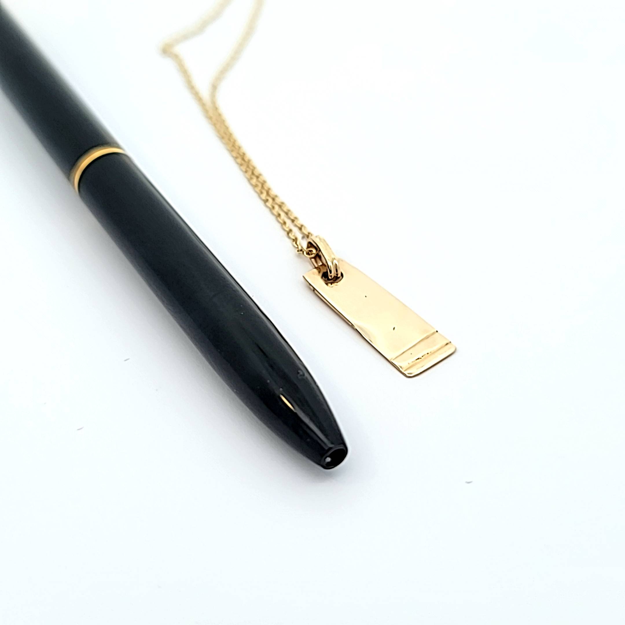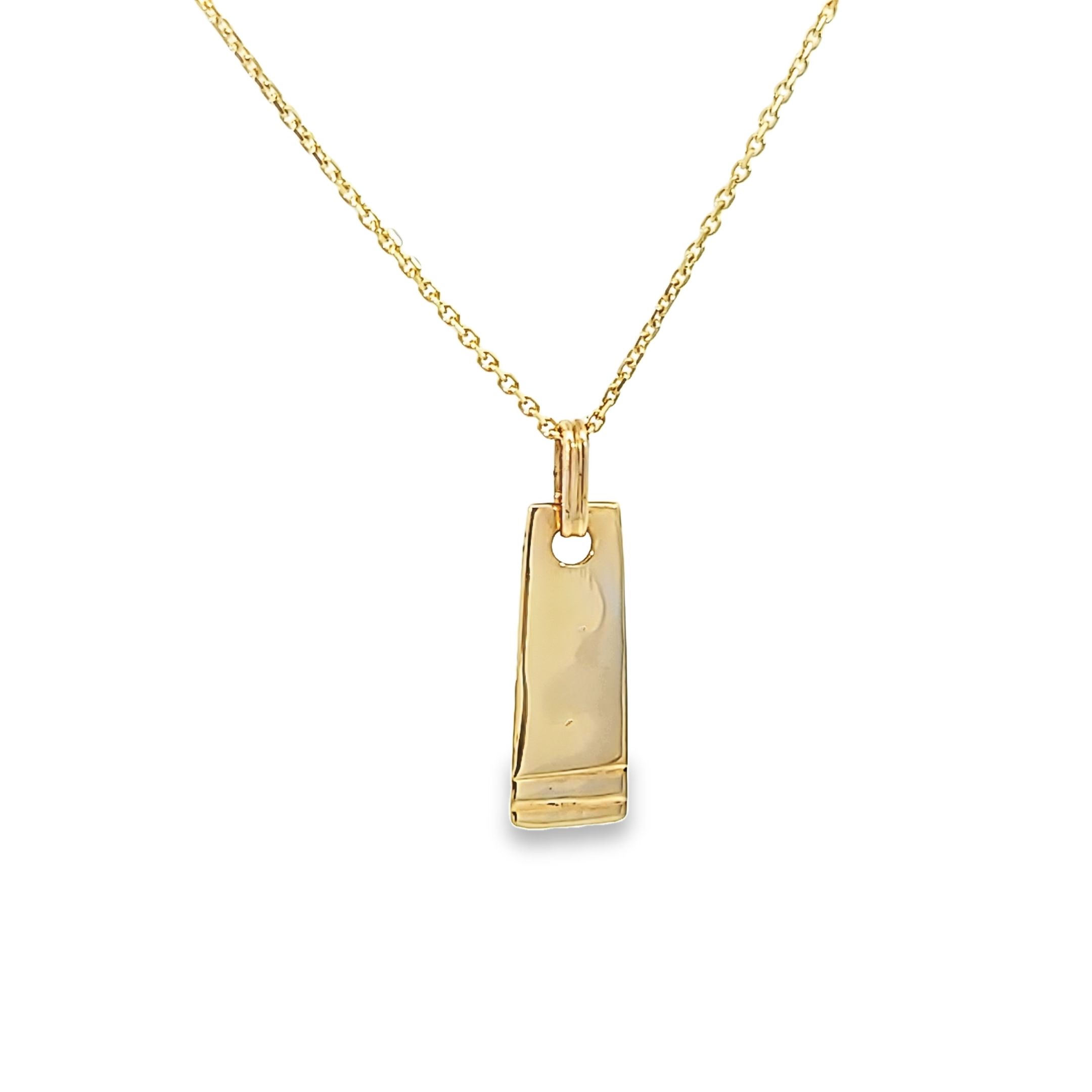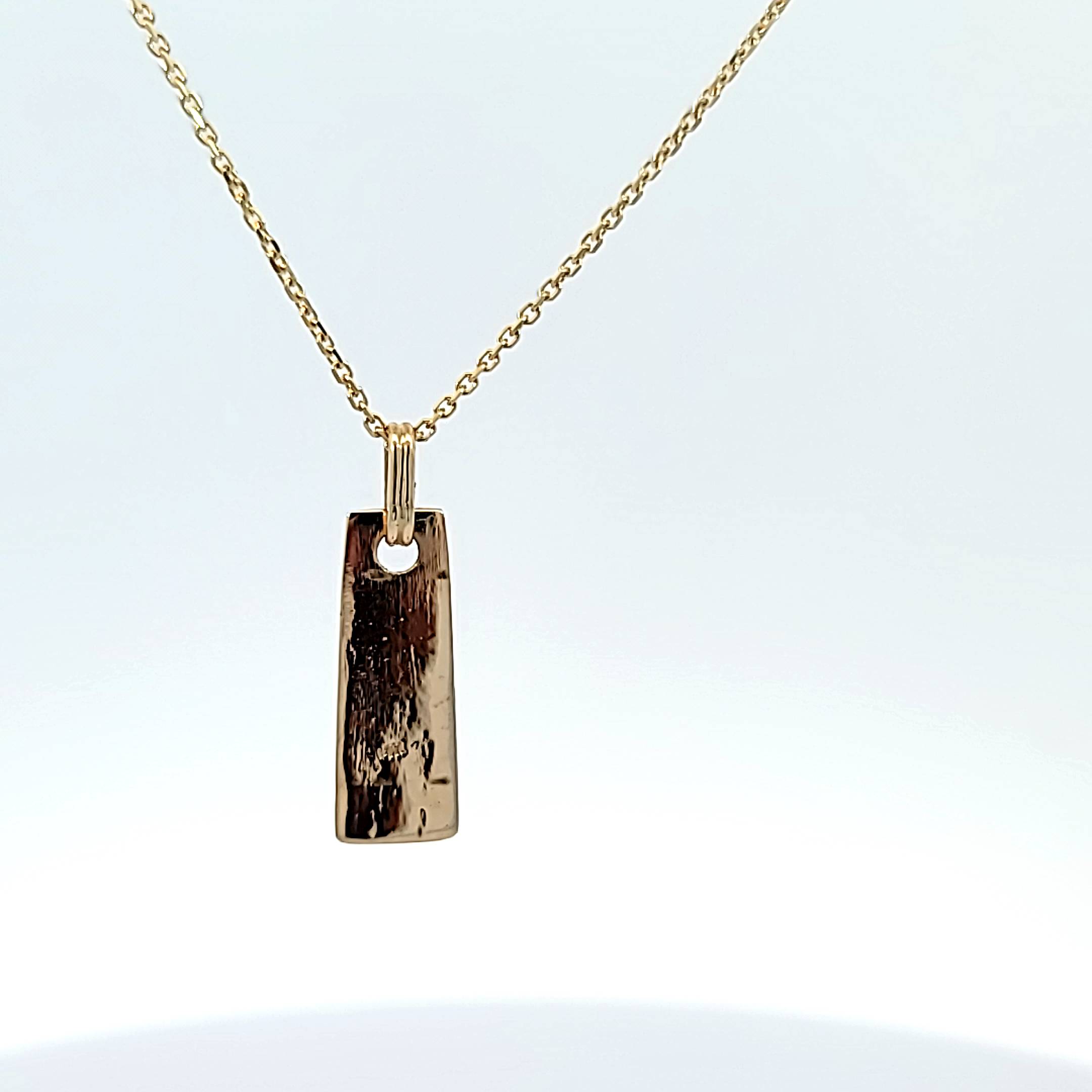 Stunning handcrafted designed pendant and then cast in 14 kt yellow or white gold. This pendant is a simple lateral bar pendant that would match any look. Has minor etching at the bottom and measures 21.5 x 7.8 mm at the widest point. This can also be paired with matching earrings also available.