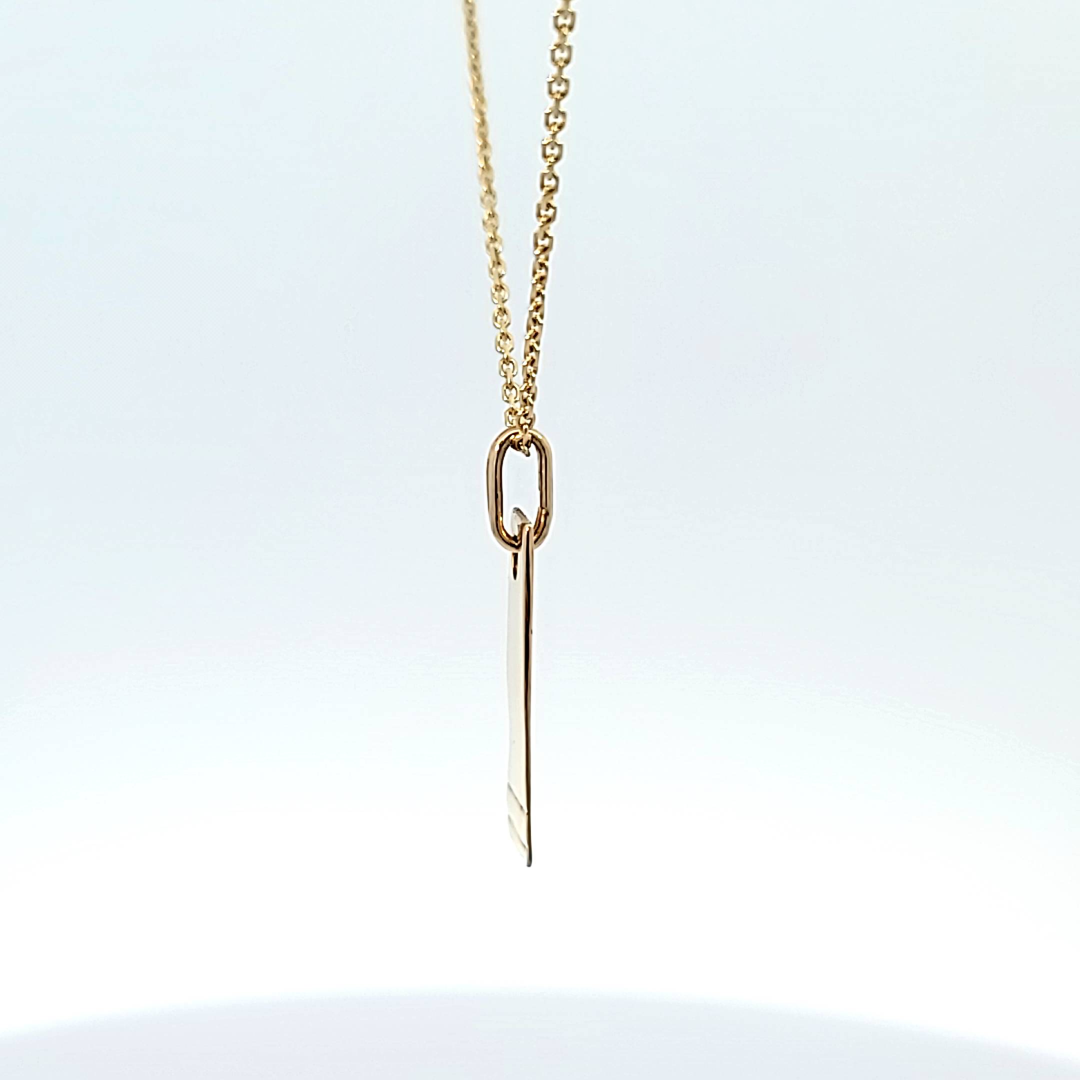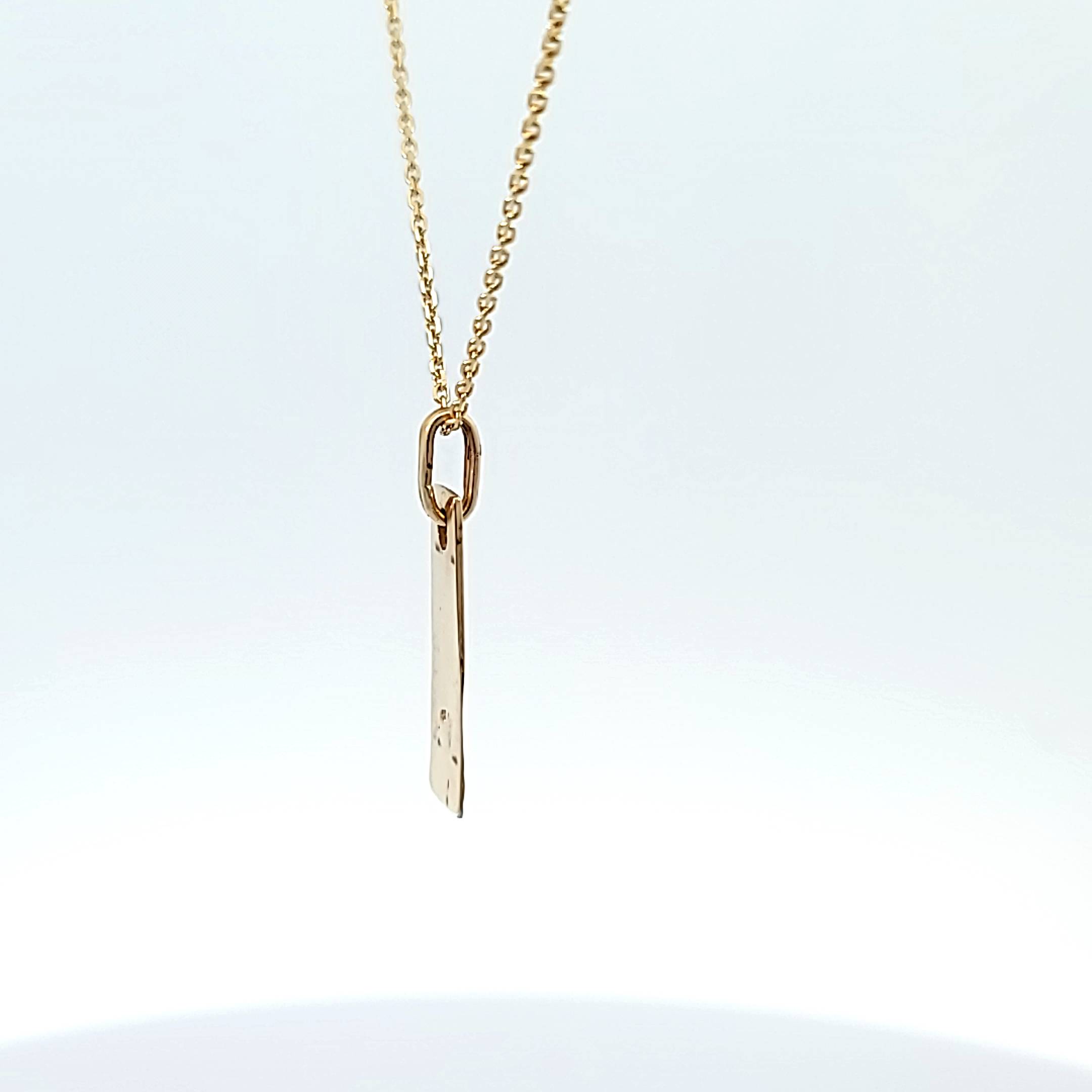 Stunning handcrafted designed pendant and then cast in 14 kt yellow or white gold. This pendant is a simple lateral bar pendant that would match any look. Has minor etching at the bottom for a subtle elegance. This can also be paired with matching earrings also available.