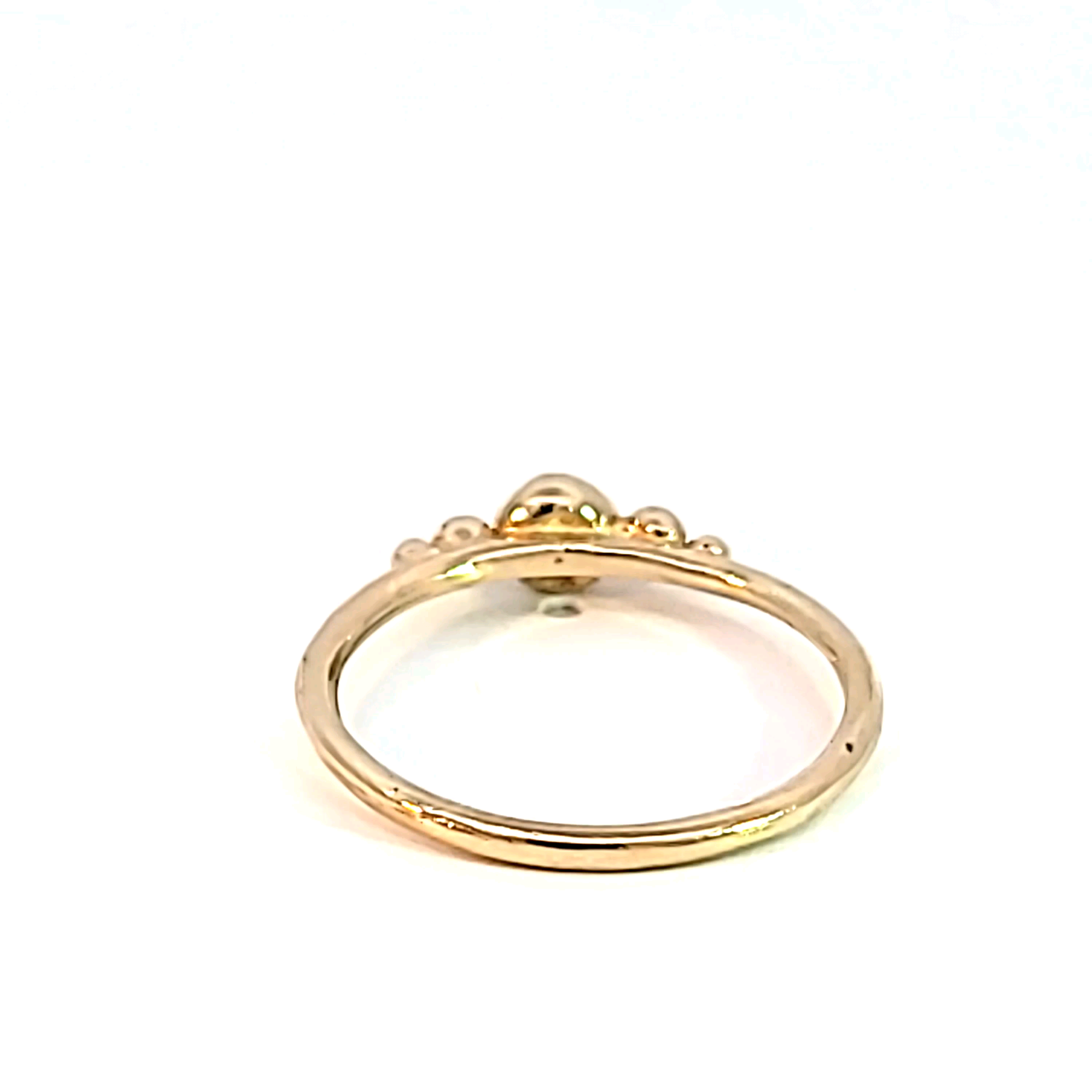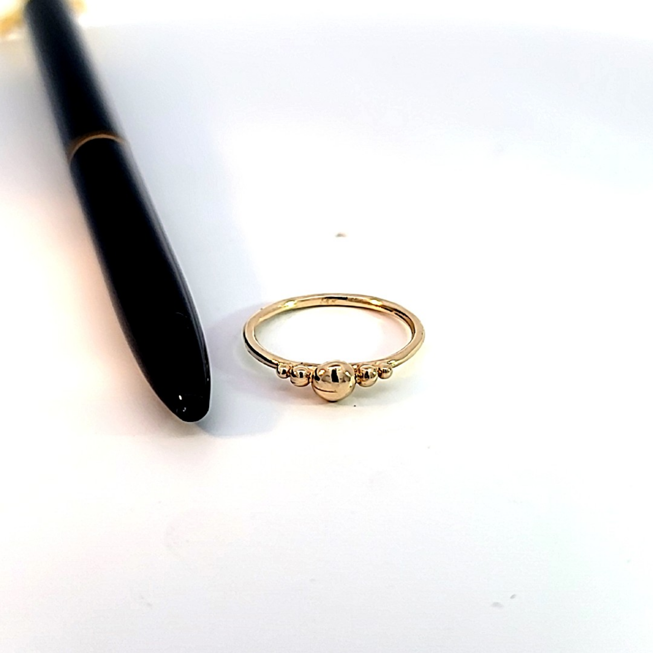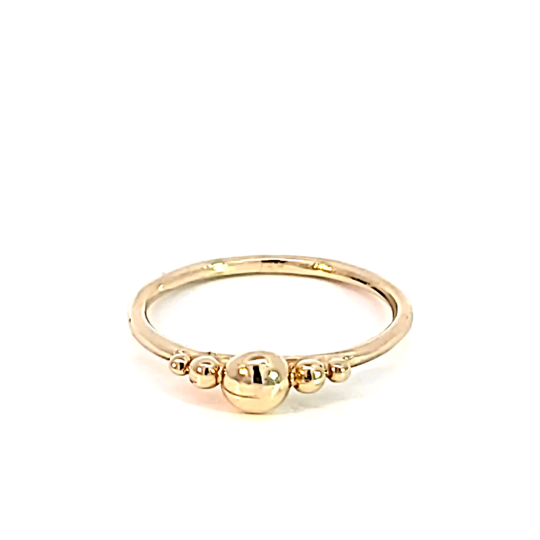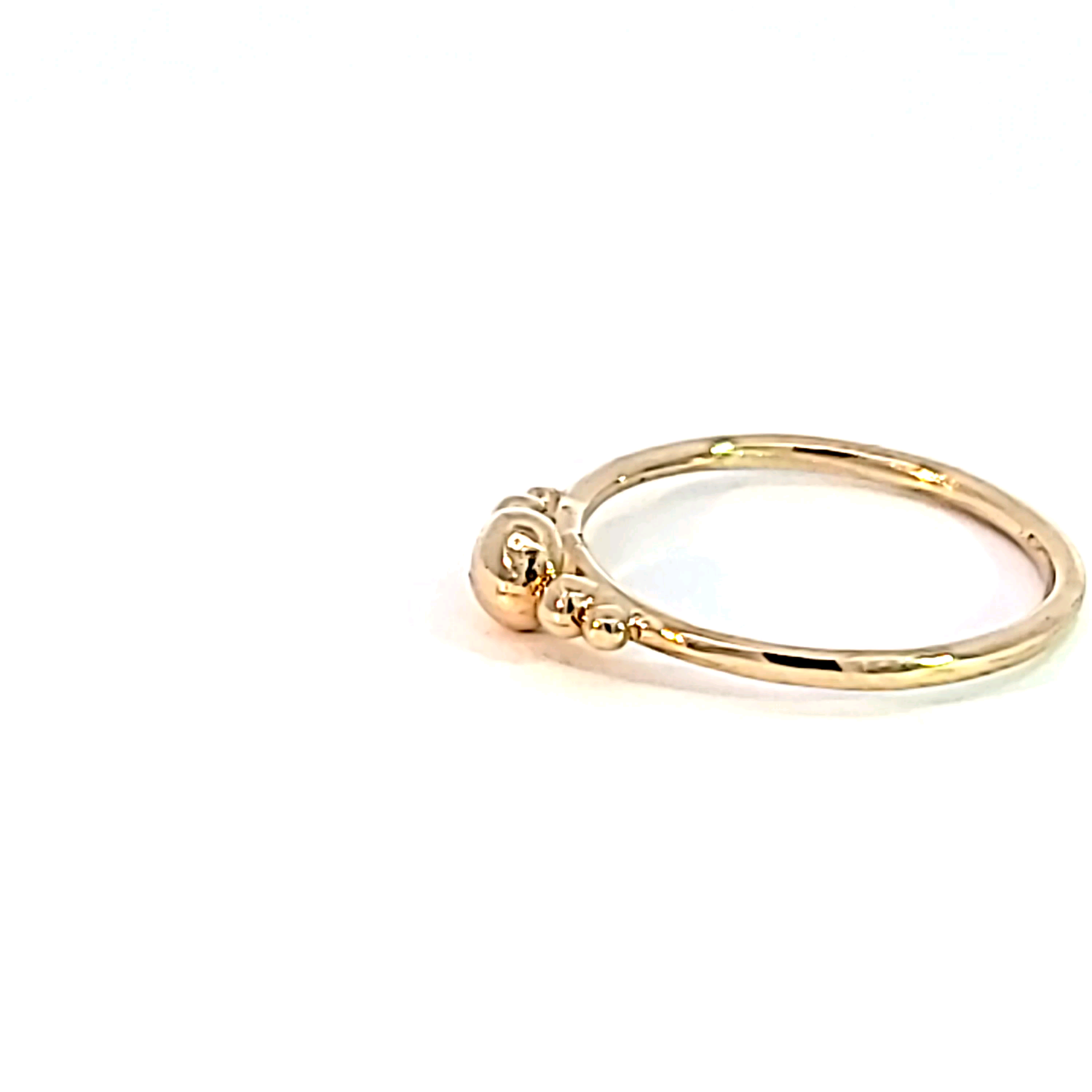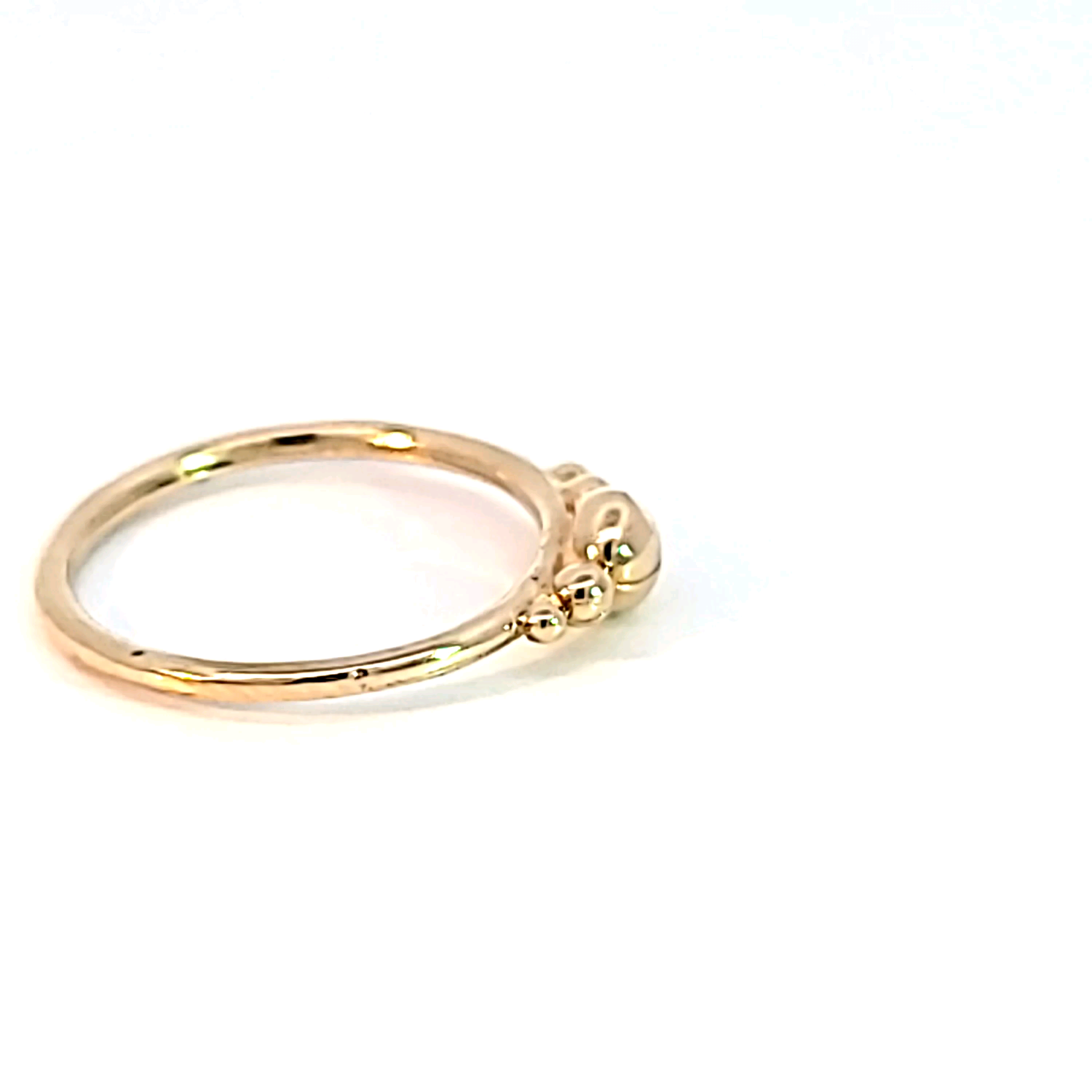 Unique custom design 14 karat yellow or white gold ring, handmade design and cast to recreate. A very dainty ring that can stand alone or be worn stackable with other pieces. Round thin band with 5 round gold embellishments mounted on top. Weighs approximately 2 grams and is also available in white gold.