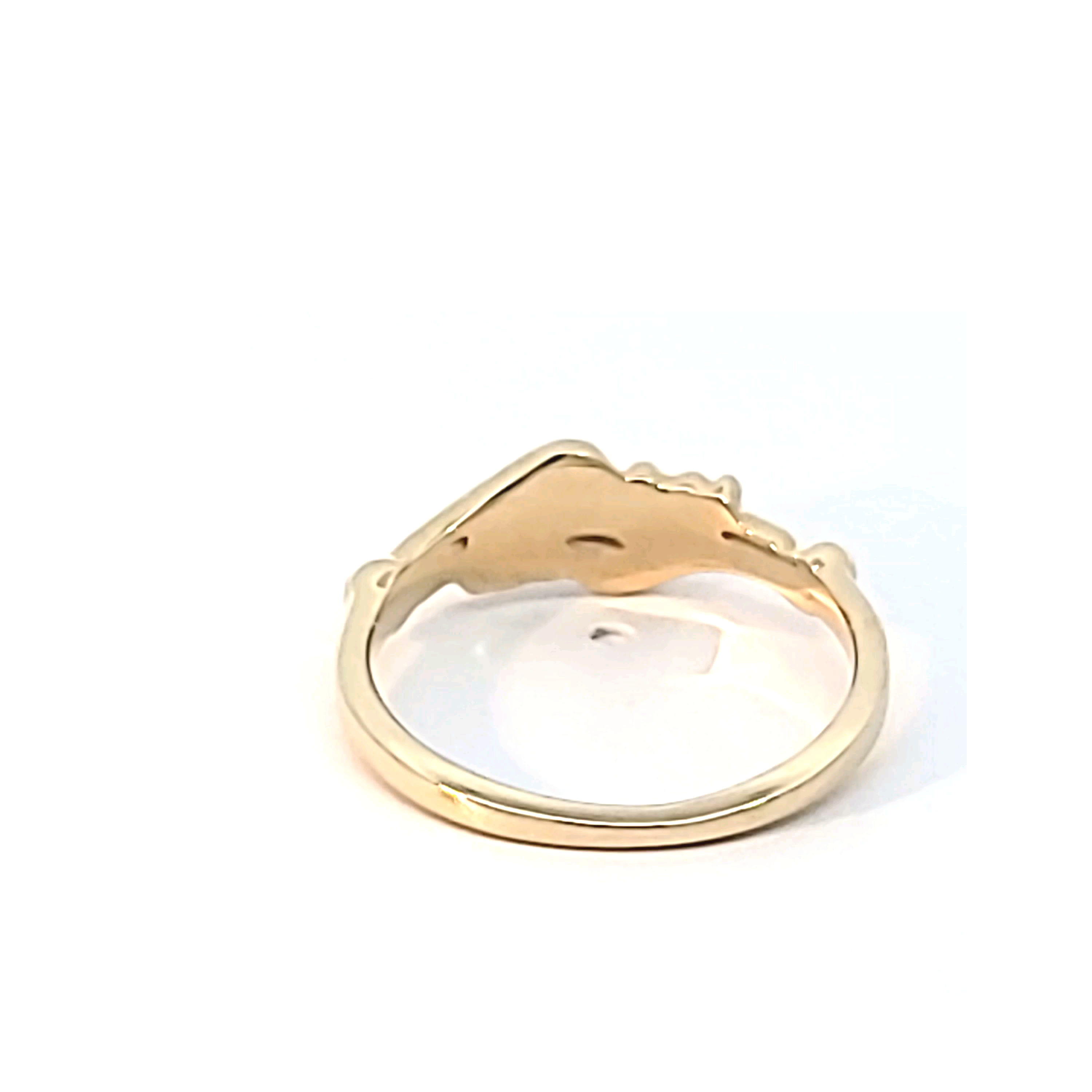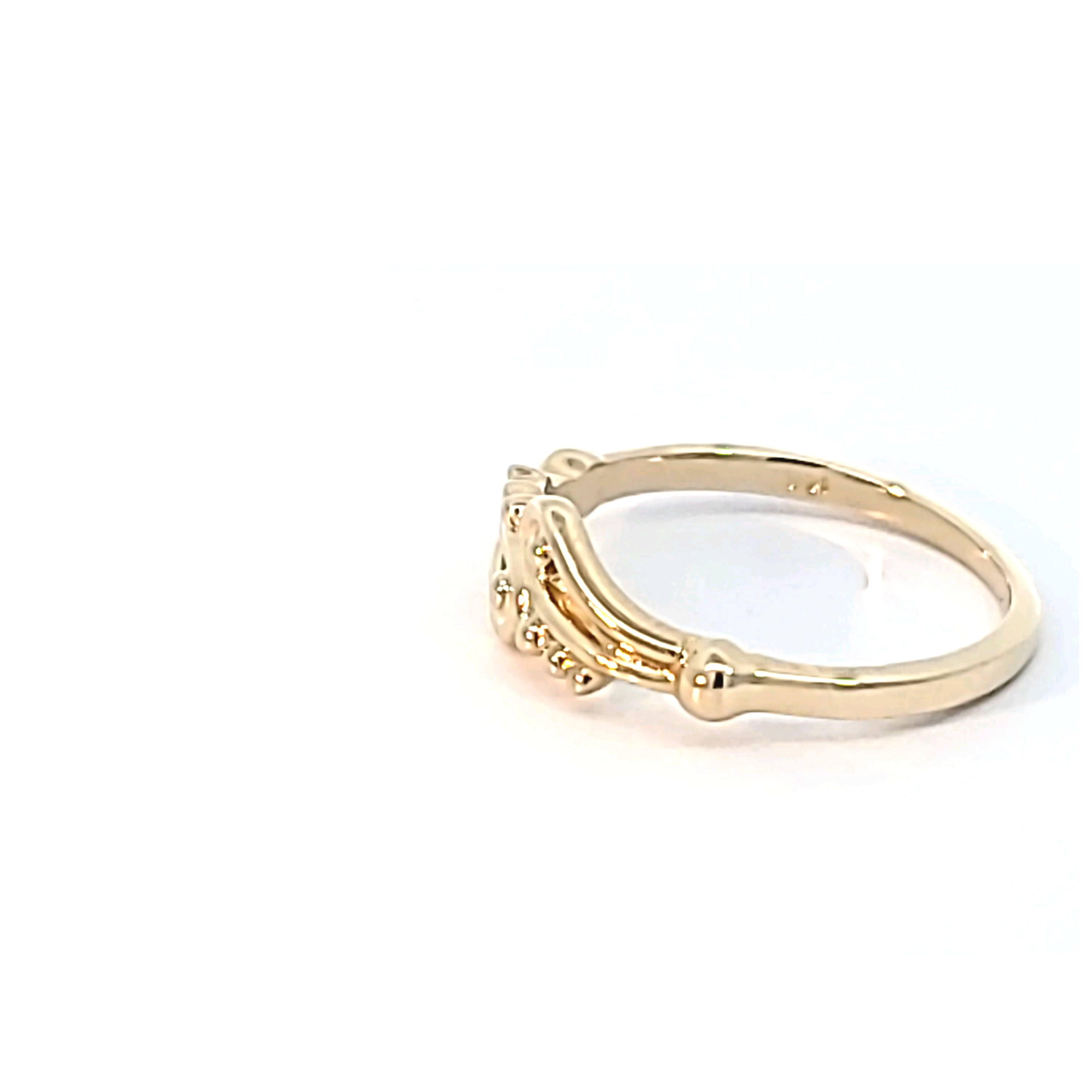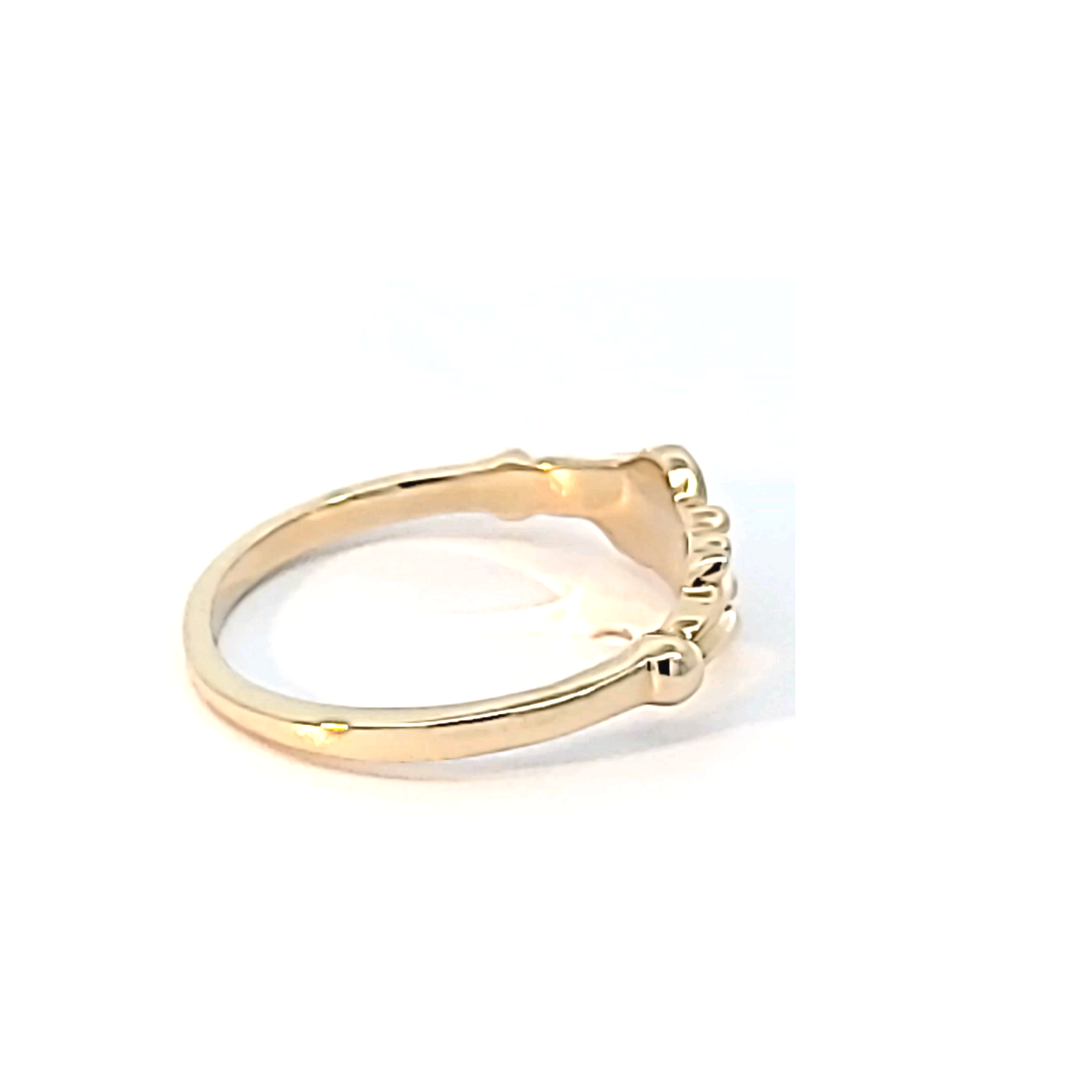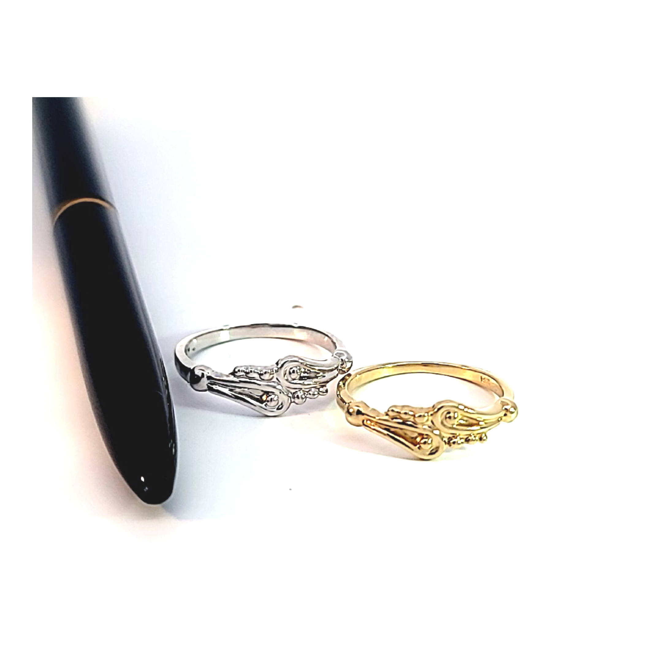 Handmade originally then cast to recreate, 14 karat yellow or white gold dainty ring with teardrop and round embellishments. Artistic ring that would be a great staple to wear every day. Weighing a little over 2 grams, also available in white gold.