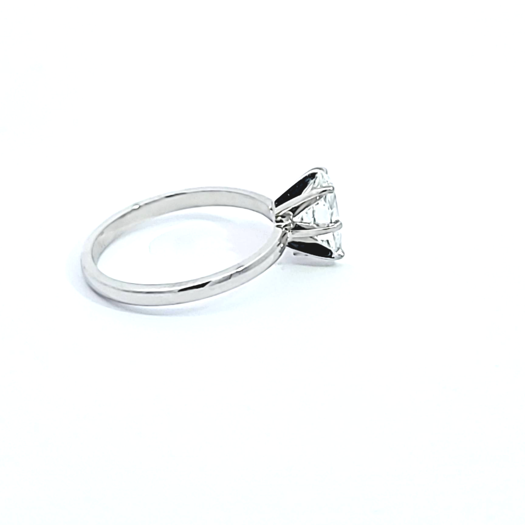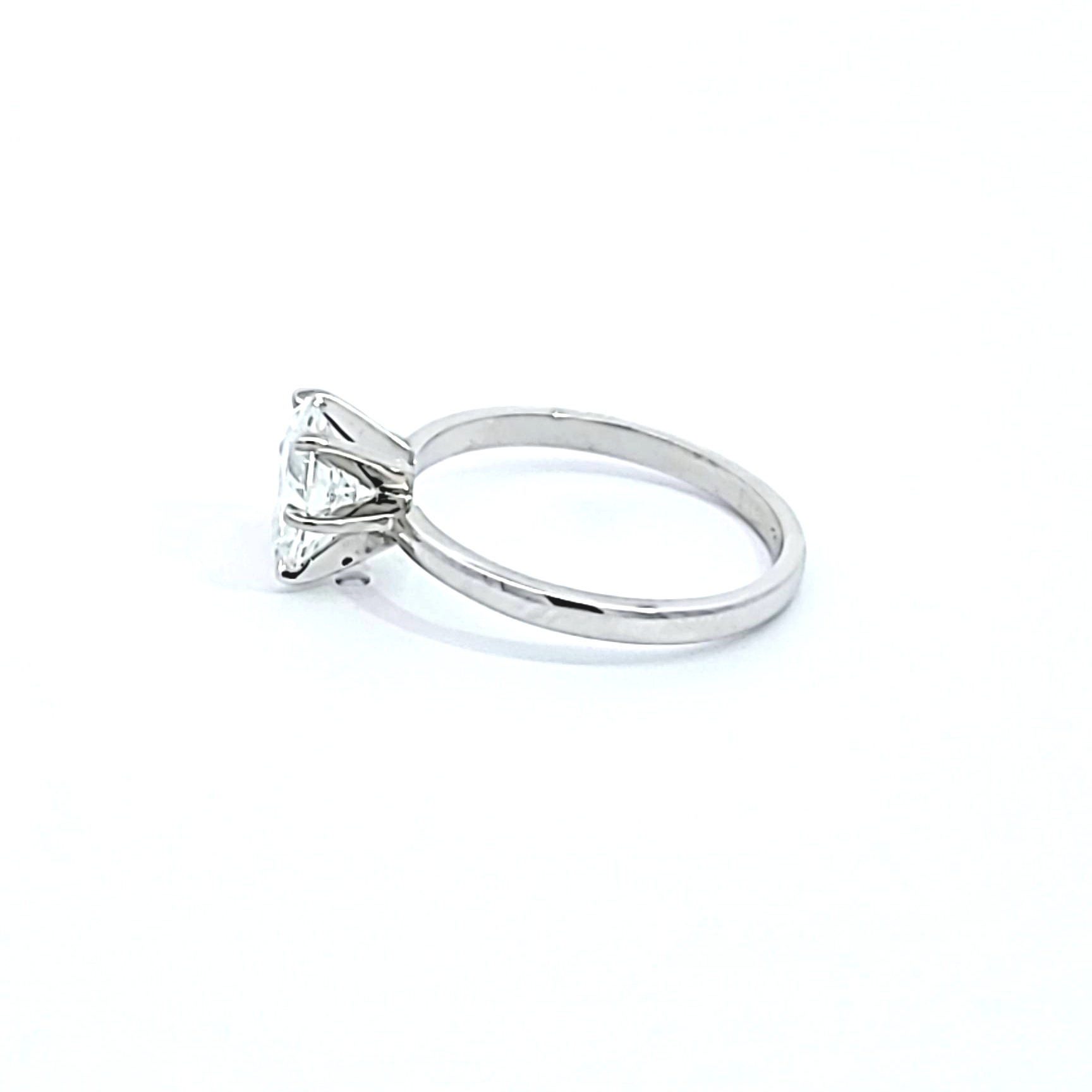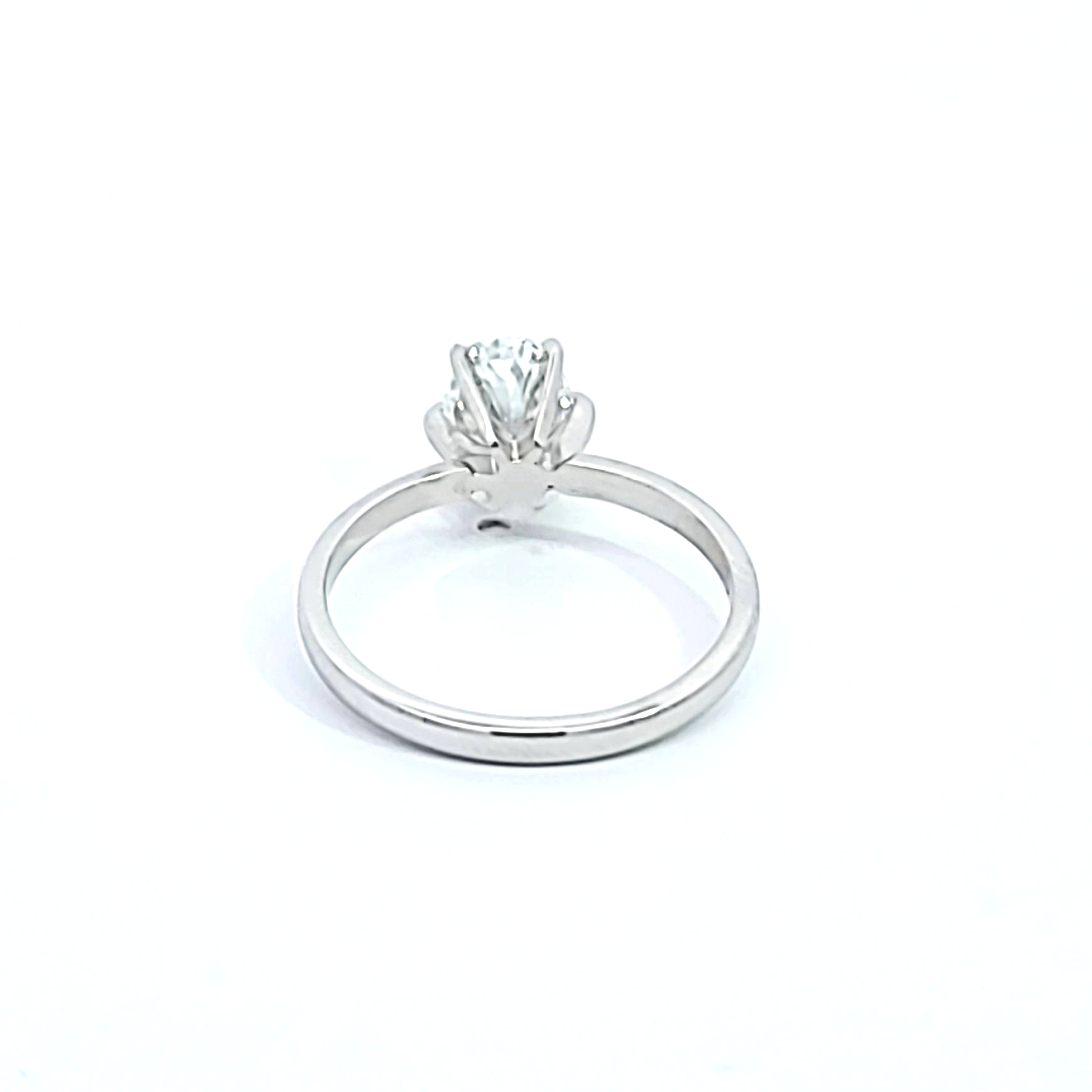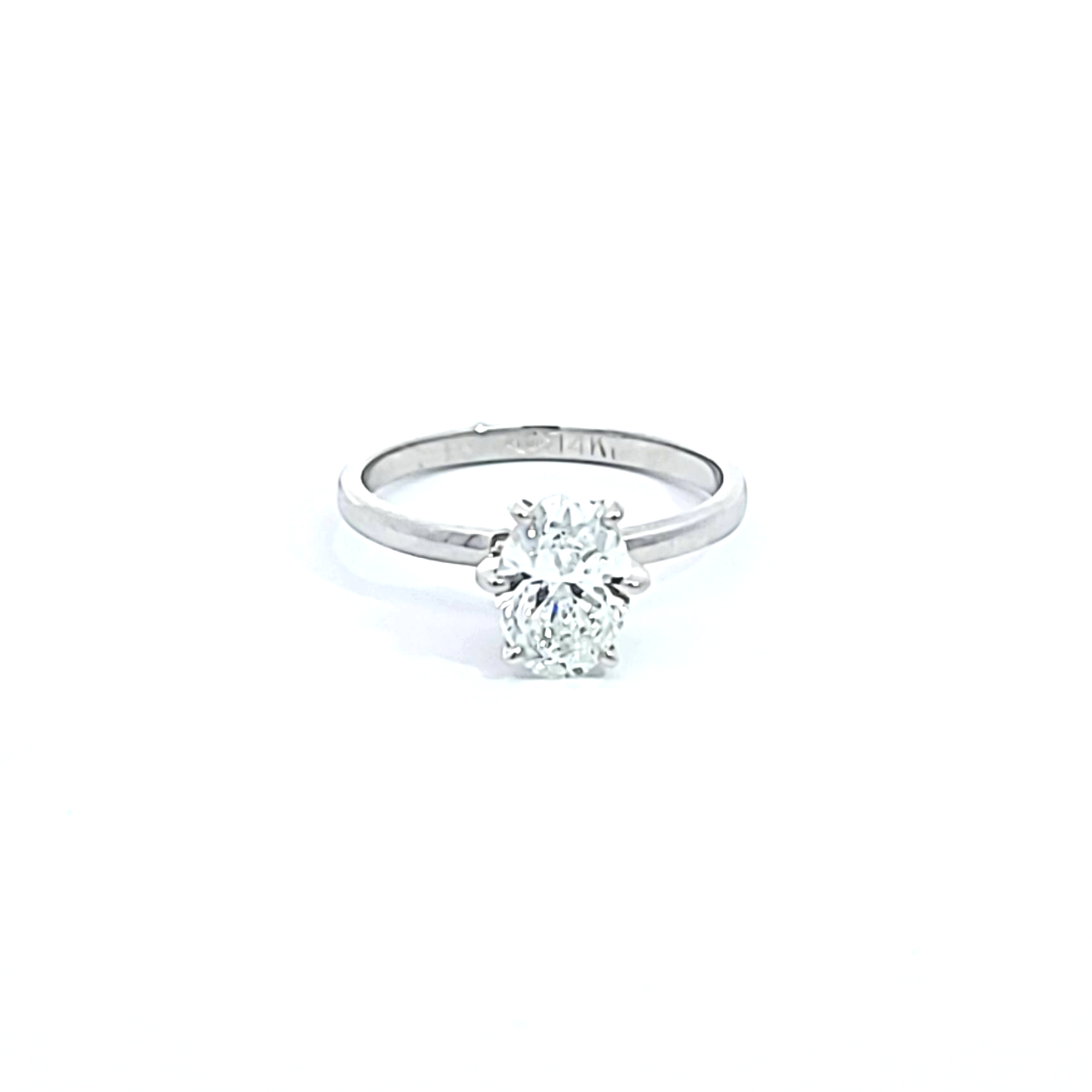 A classic solitaire mounted in 14 karat white or yellow gold with a dainty flat, curved style 1.6 mm band with a low-profile head mounting. The center diamond is an Oval Lab-grown diamond at a minimum 1.20 carat size, set in 6 prongs. Color range in Lab Grown Diamonds will be between D-G, and Clarity will be at the minimum SI1. (Diamond pictured is 1.23 carat)