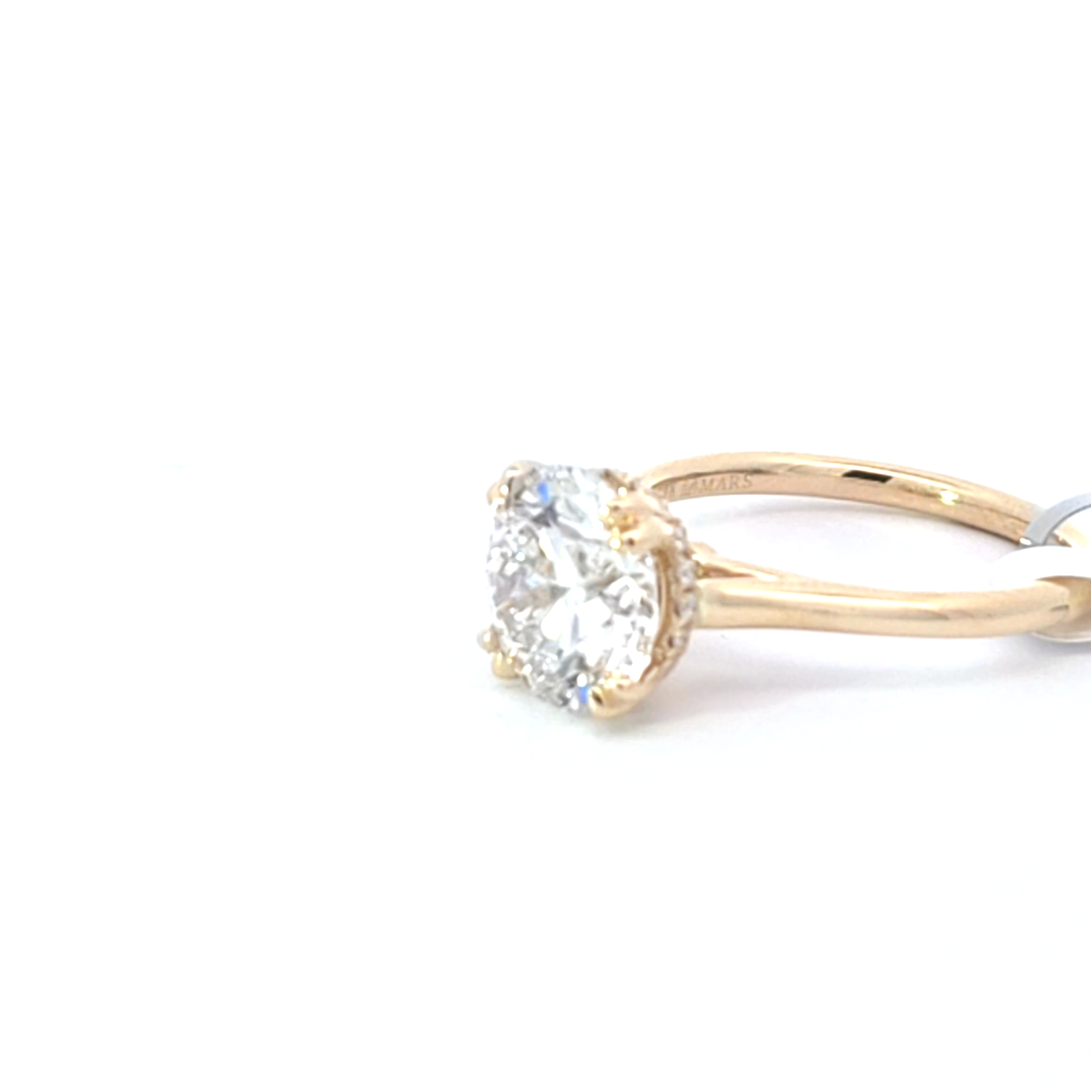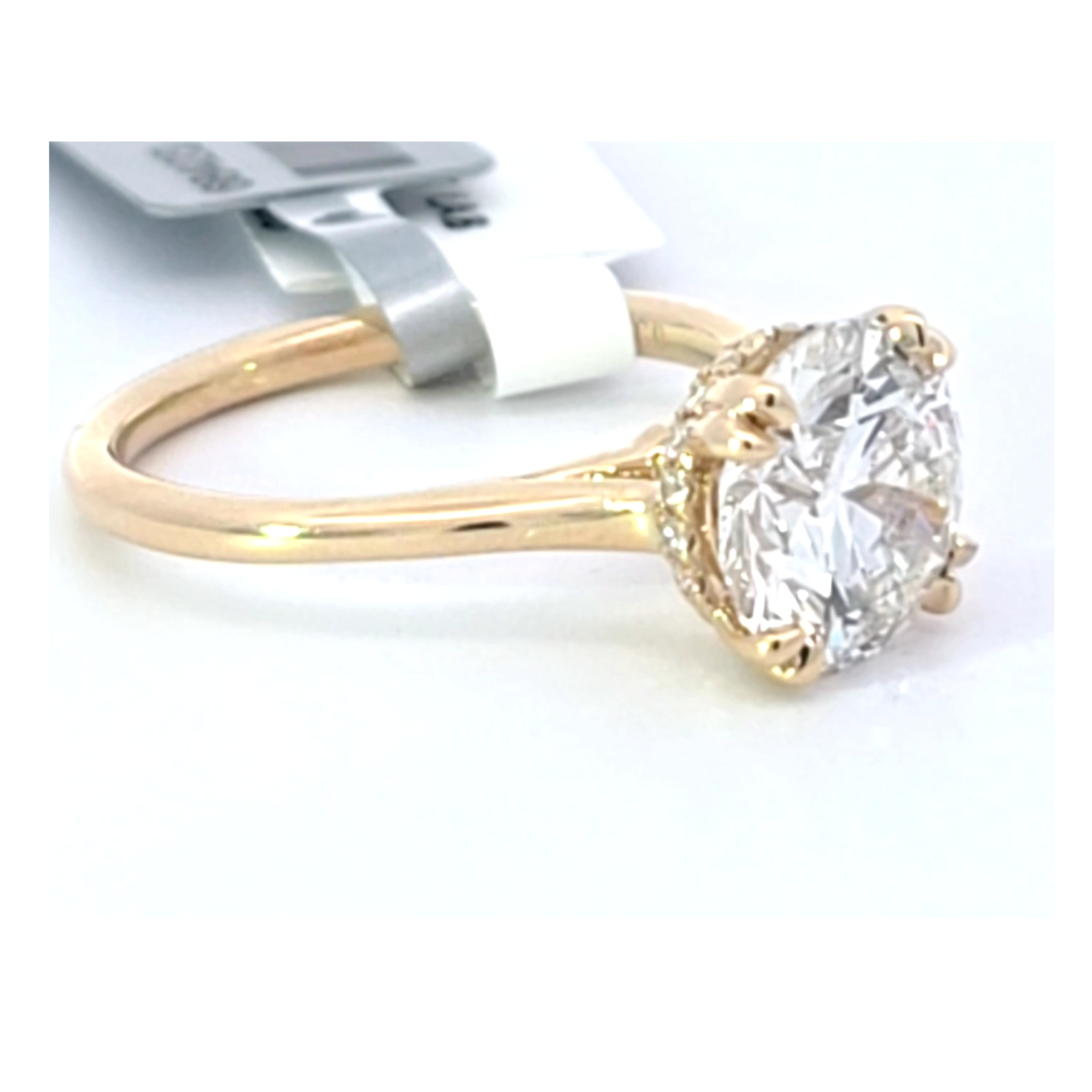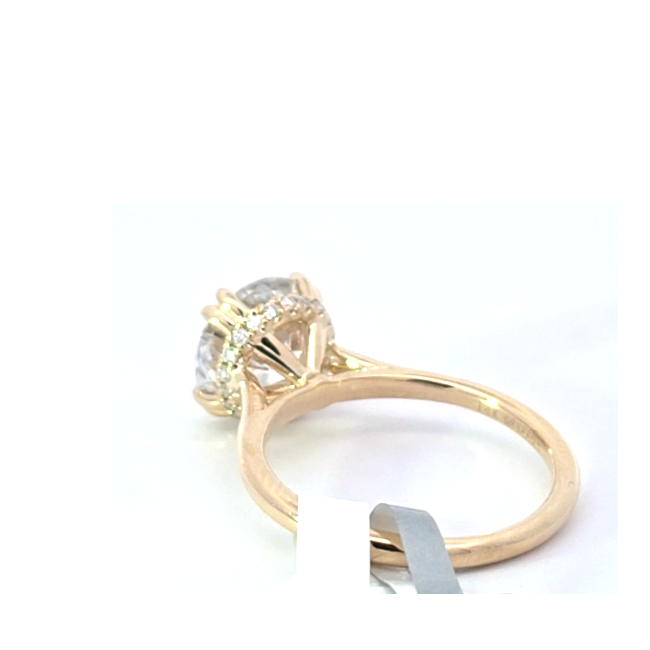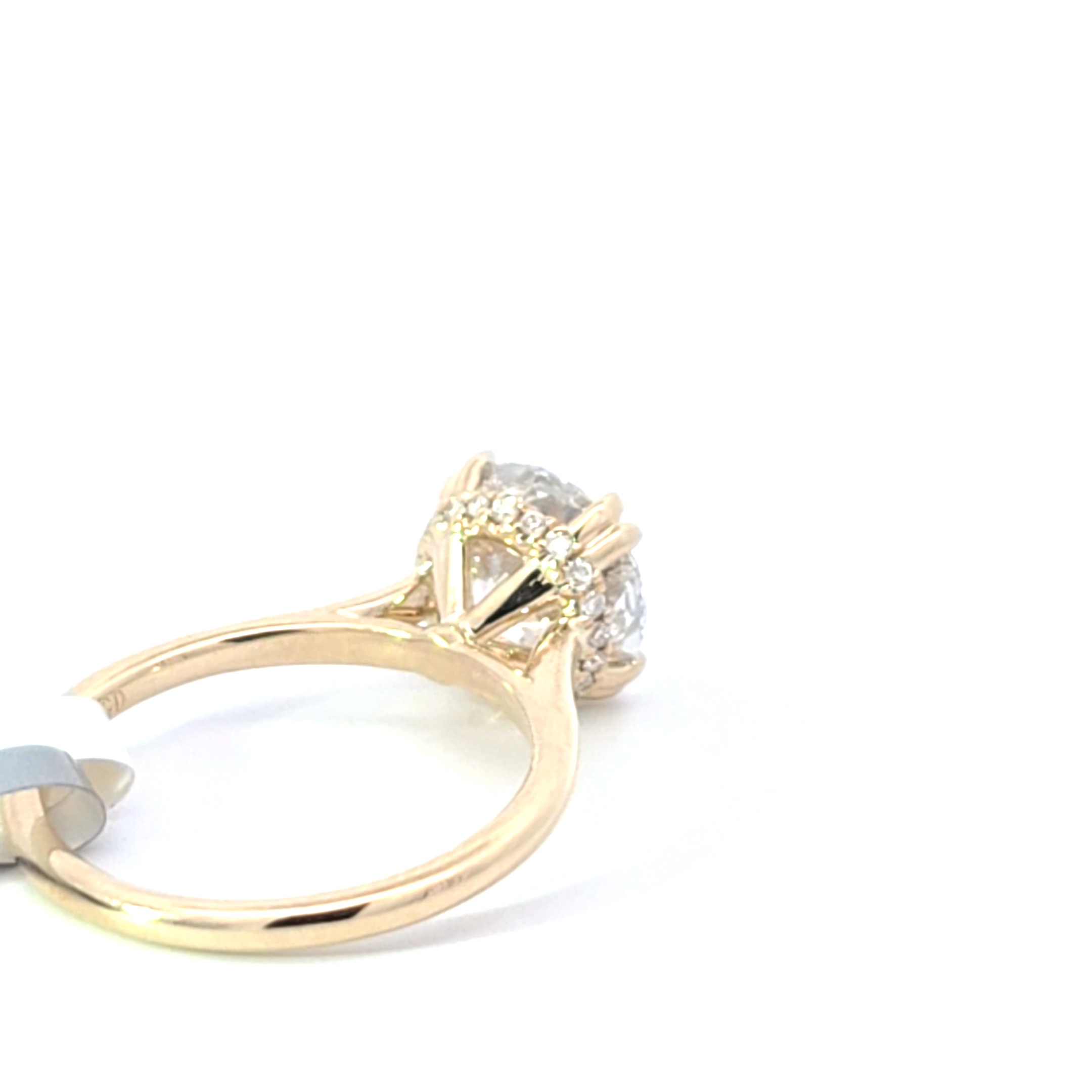 This exquisite solitaire diamond engagement ring makes a huge impact with a subtle hidden halo, while remaining a timeless classic. A 14 karat yellow gold dainty mounting (available in white gold and platinum) with a Lab-grown round center diamond, minimum 3 carat. The stellar center diamond is paired with a .13 carat total weight hidden halo. Color range in Lab-Grown diamonds will be between D-G, and Clarity will be at a minimum of SI1. (Pictured is a 3.05 carat center)